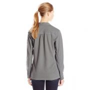 Single button-front placket with set in sleeves and darts for feminine fit and concealed rib knit cuffs dyed to match