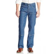 • Relaxed-fit utility jean featuring chap-style double front with cleanout opening to accommodate knee pads
